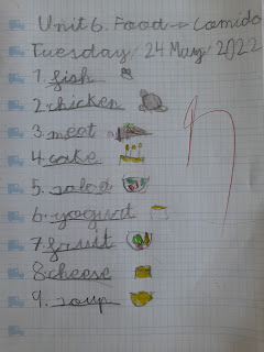 Empezamos el último tema, tema 6. Aprendemos el nuevo vocabulario y trabajamos con nuestras tarjetas de vocabulario en clase para decir qué comidas nos gustan y cuáles no.